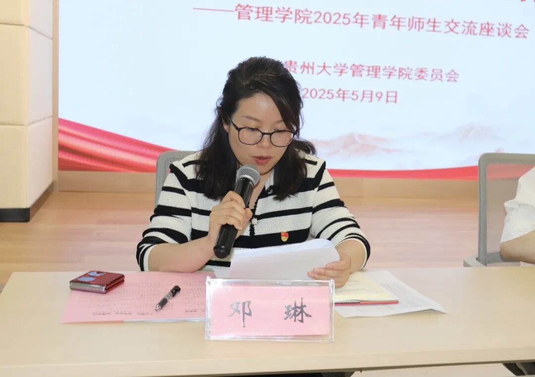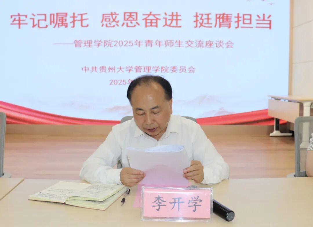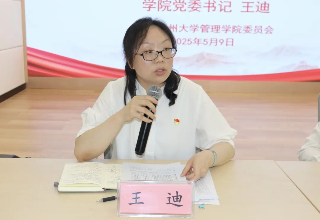 2025年5月9日星期五中午在管理学院3楼报告厅召开“牢记嘱托 感恩奋进 挺膺担当”管理学院2025年青年师生交流座谈会,会议由学院党委书记王迪主持,参会人员有学院党委班子部分成员、全体辅导员、青年教师和学生代表。