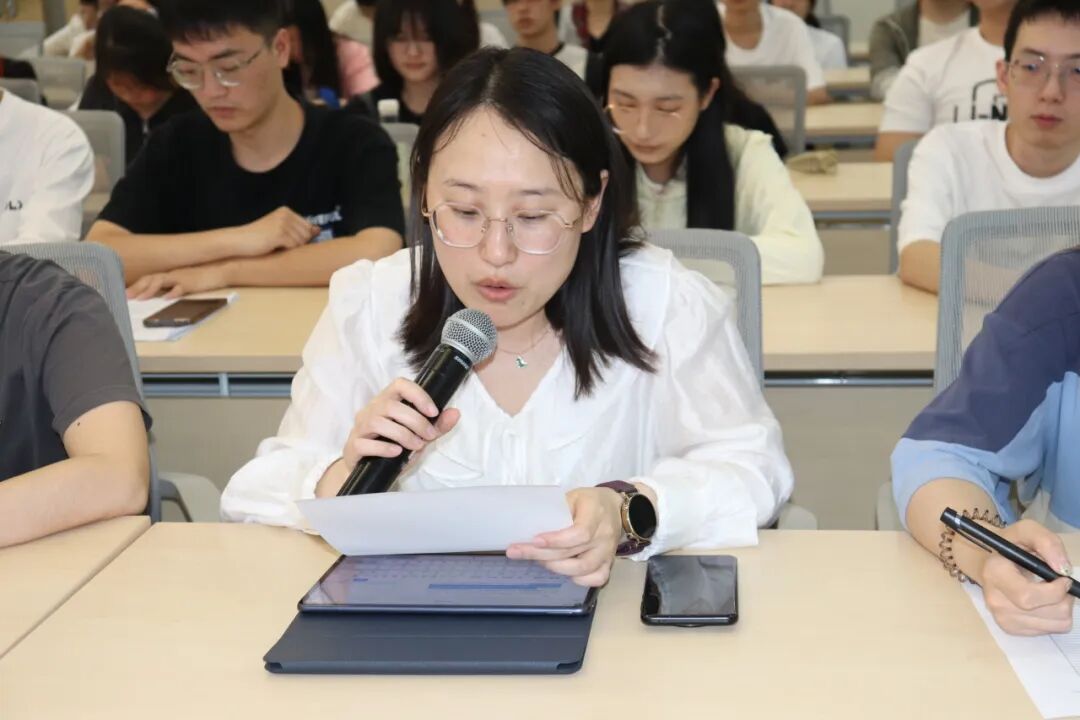 与会师生交流发言。首先是青年教师代表李孟燃,她提到青年应脚踏实地,珍惜在校时光,努力学习,储备知识,培养思维,将个人理想与国家理想相结合,积极参与学科竞赛和学术研究,在实践中磨砺自己,到国家最需要的地方施展才华。