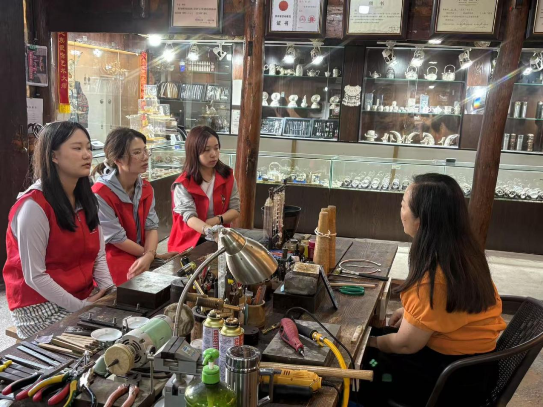 实践队探访了贵州当地的苗族银饰工坊——龙井银坊,实践队采访了首位打破“传男不传女”旧俗的银匠。她不仅推动技艺传承,还带动村民居家就业,与高校合作开展实践教学,助力民族文化时尚化。工坊尝试结合自媒体推广,但亟需专业运营支持。团队发现,苗族银饰在保留传统符号的同时,正通过镶嵌、编造等创新工艺走向现代市场,成为乡村振兴的特色产业。