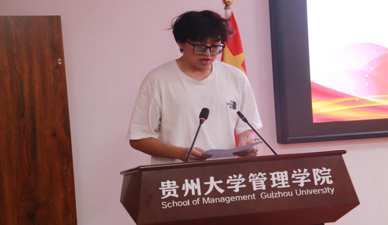 会议第二项议程,由学生代表发言。周文瑞代表全体实践队员承诺,将以饱满的热情、务实的态度投入到实践活动中,虚心学习、勇于实践,用实际行动践行青春使命,为乡村发展贡献自己的力量,不辜负学院领导和老师的期望,展现新时代管理学院青年的昂扬风貌。