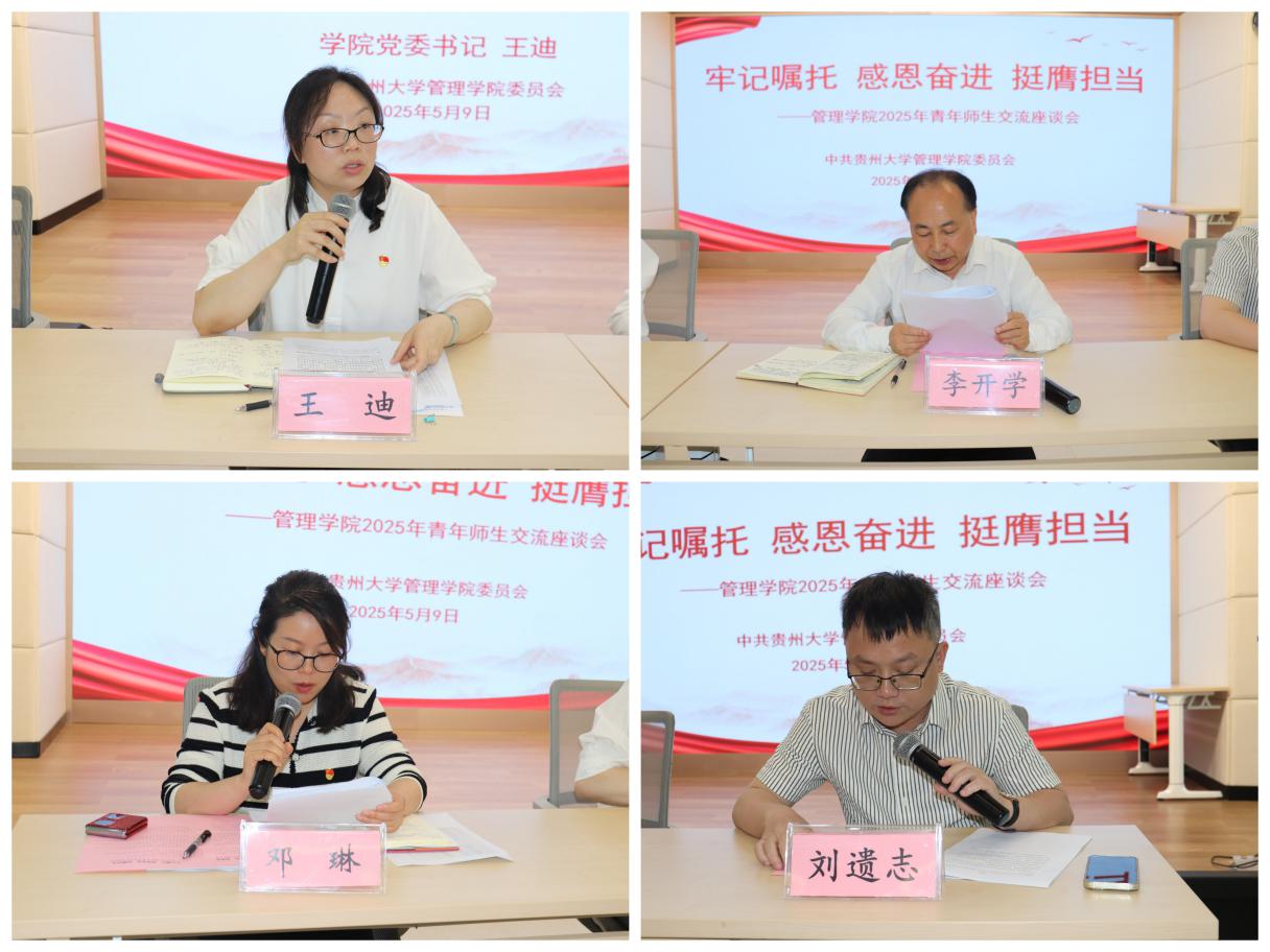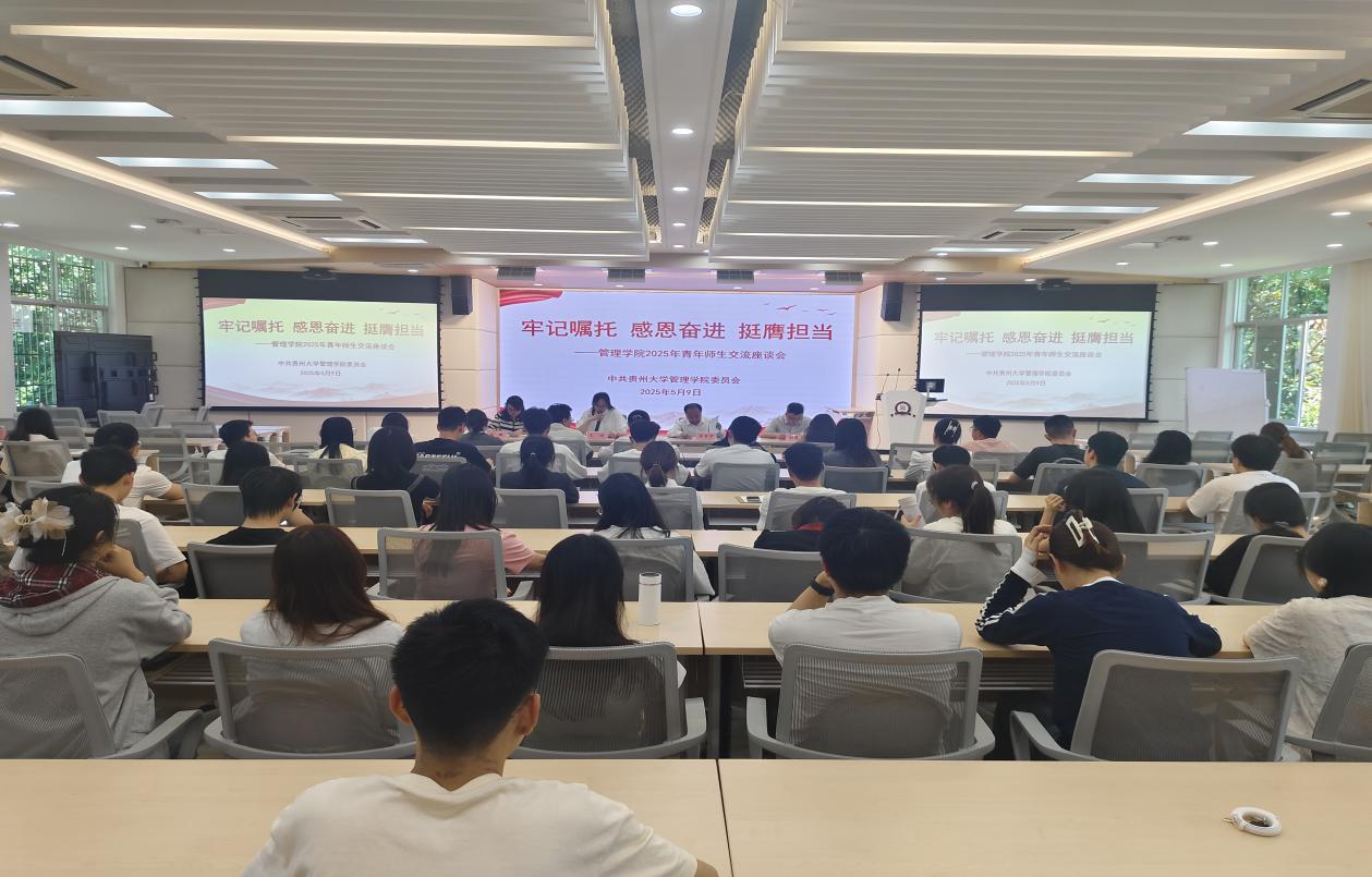 2025年5月9日星期五中午在管理学院3楼报告厅召开“牢记嘱托 感恩奋进 挺膺担当”管理学院2025年青年师生交流座谈会,会议由学院党委书记王迪主持,参会人员有学院党委班子部分成员、全体辅导员、青年教师和学生代表。
