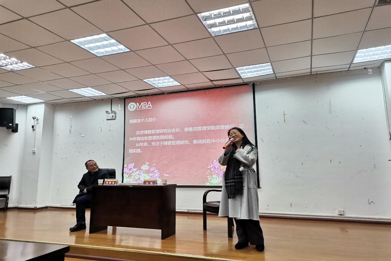 2021年1月10日上午,在慎思楼MBA报告厅,北京博雅管理研究会会长顺波,贵州新基石建筑设计有限责任公司董事长、总经理刘颖应邀来到乐动官方网站MBA教育中心管理知识讲堂,以“有效管理者的五项修炼”为题做管理前沿知识专题讲座,讲座由管理学院MBA教育中心副主任何跃勇主持,管理学院MBA教育中心2018级、2019级和2020级研究生150余人到场聆听。