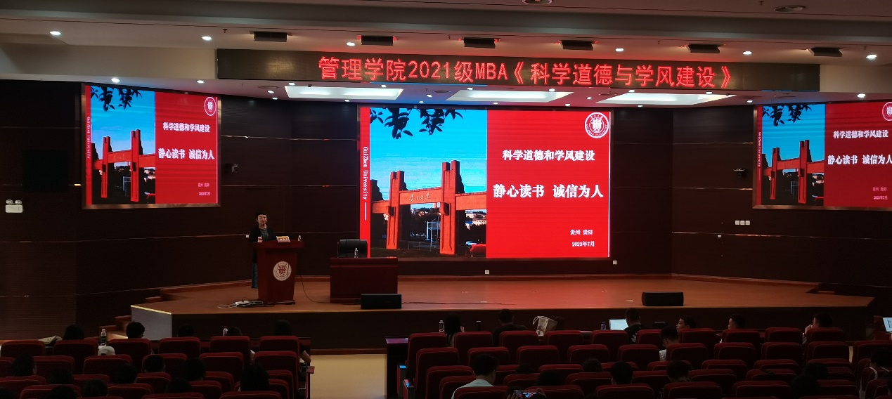 2023年7月8日,乐动官方网站MBA教育中心在贵州大学贤正楼107报告厅举办了《科学道德与学风建设》系列讲座,讲座分三场进行,分别由贵州大学正处级组织员、管理学院党委副书记(主持党委工作)周莉莉教授、乐动官方网站院长李烨教授、乐动官方网站工商管理系主任许为宾教授主讲,250余名2021级MBA学生到场聆听。讲座由乐动官方网站MBA教育中心副主任何跃勇老师主持。